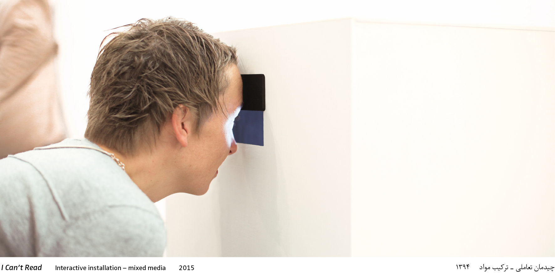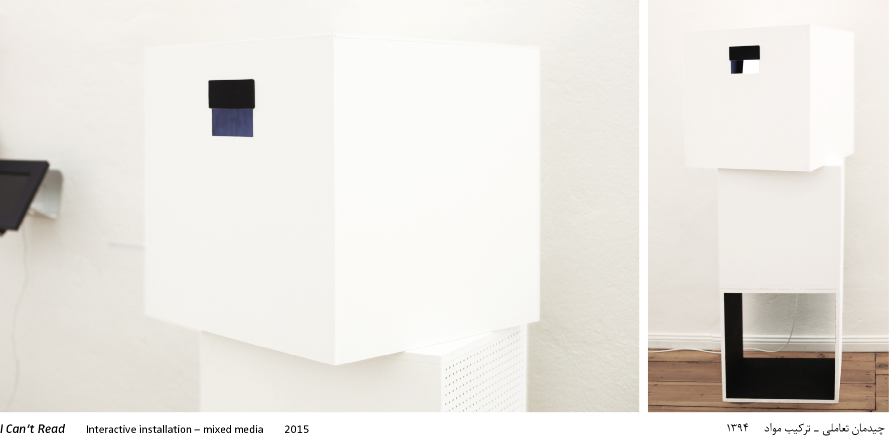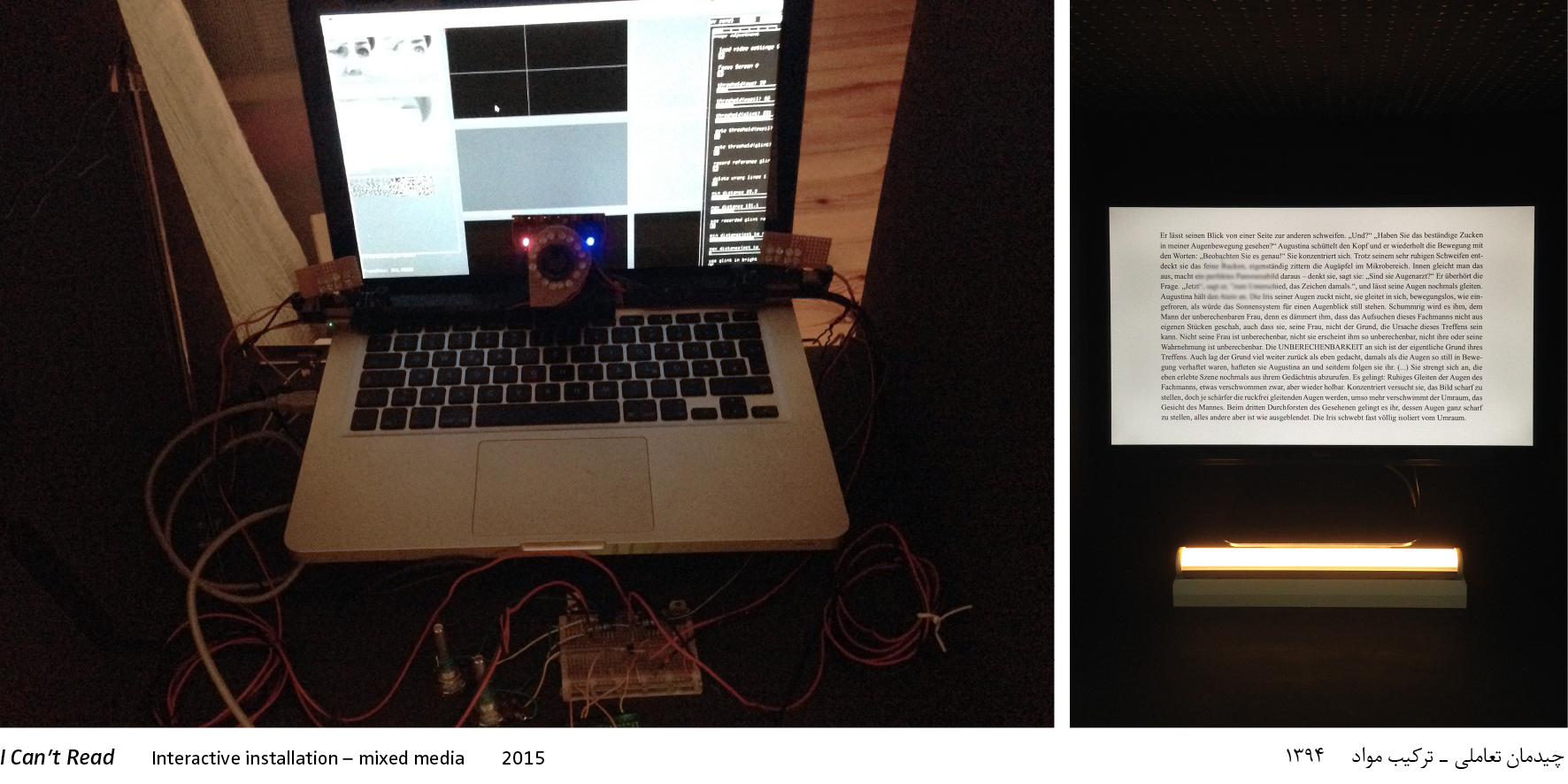 I Can‘t Read examines the subject of reading as a movement mechanism. It deals with the different phases the eye passes during the reading process that we are not aware of. When reading, the eye moves continuously along a line of text, while yet no information is absorbed. The reception of information happens after the saccade (quick, eye movements from one eye position to another), during the fixation (the point at which a saccade jumps to), when the eye rests on one position and fixes. In I Can‘t Read an eye tracking system follows the viewers eye movements. Inside the white box there is a written text on a screen, but there is a blurry spot too that always moves exactly where one just want to look at! So I Can‘t Read – a distortion of perception habits.