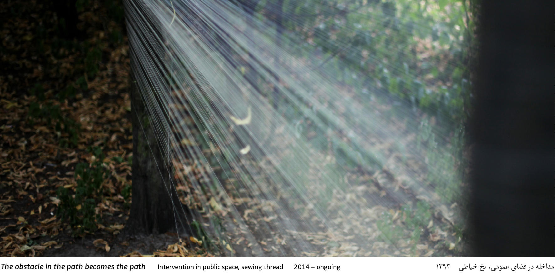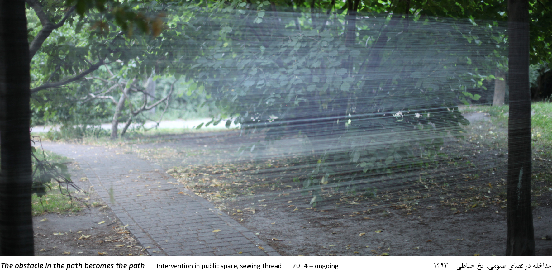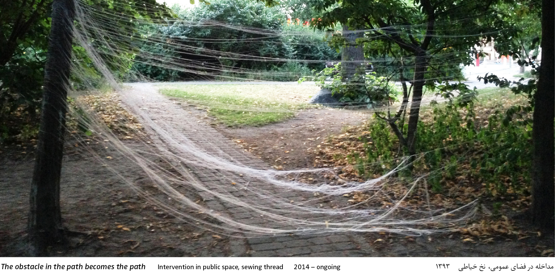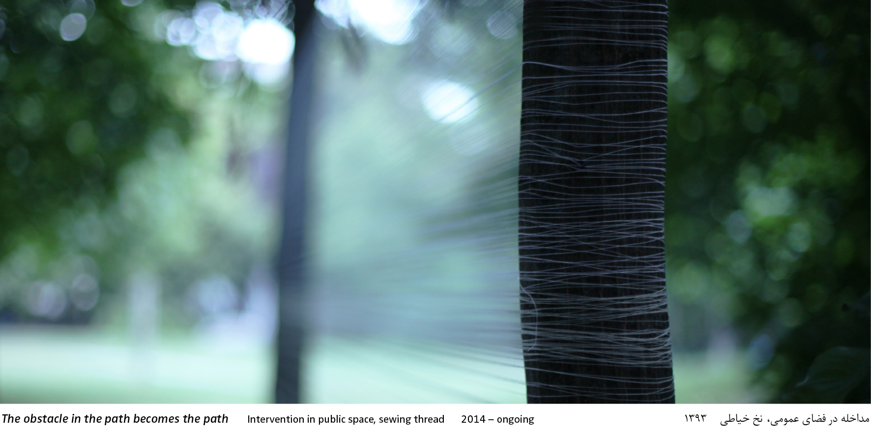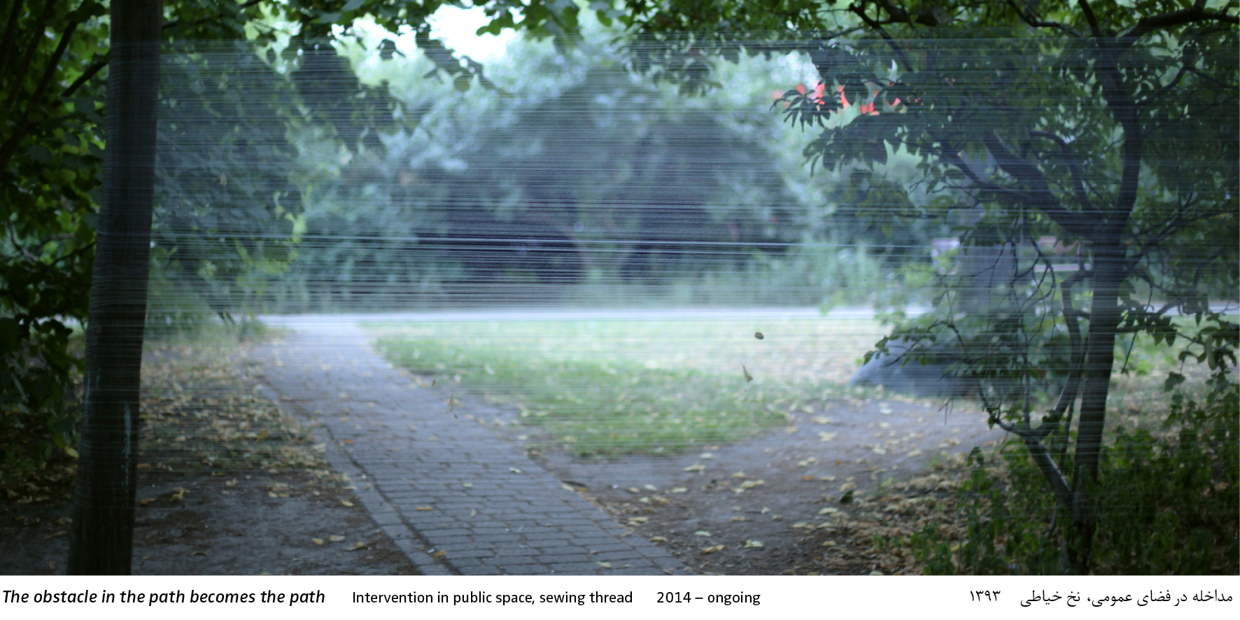 Overnight white sewing thread is stretched between two trees to interrupt a usual small path. By this very insignificant and semitransparent obstacle, while walking, the pedestrians do not notice the fact that the way is closed off until they are right in front of it. So most of them are irritated for a short moment (dissonant state) and are disturbed in their daily routine. Finally, they have to choose another way than usual.