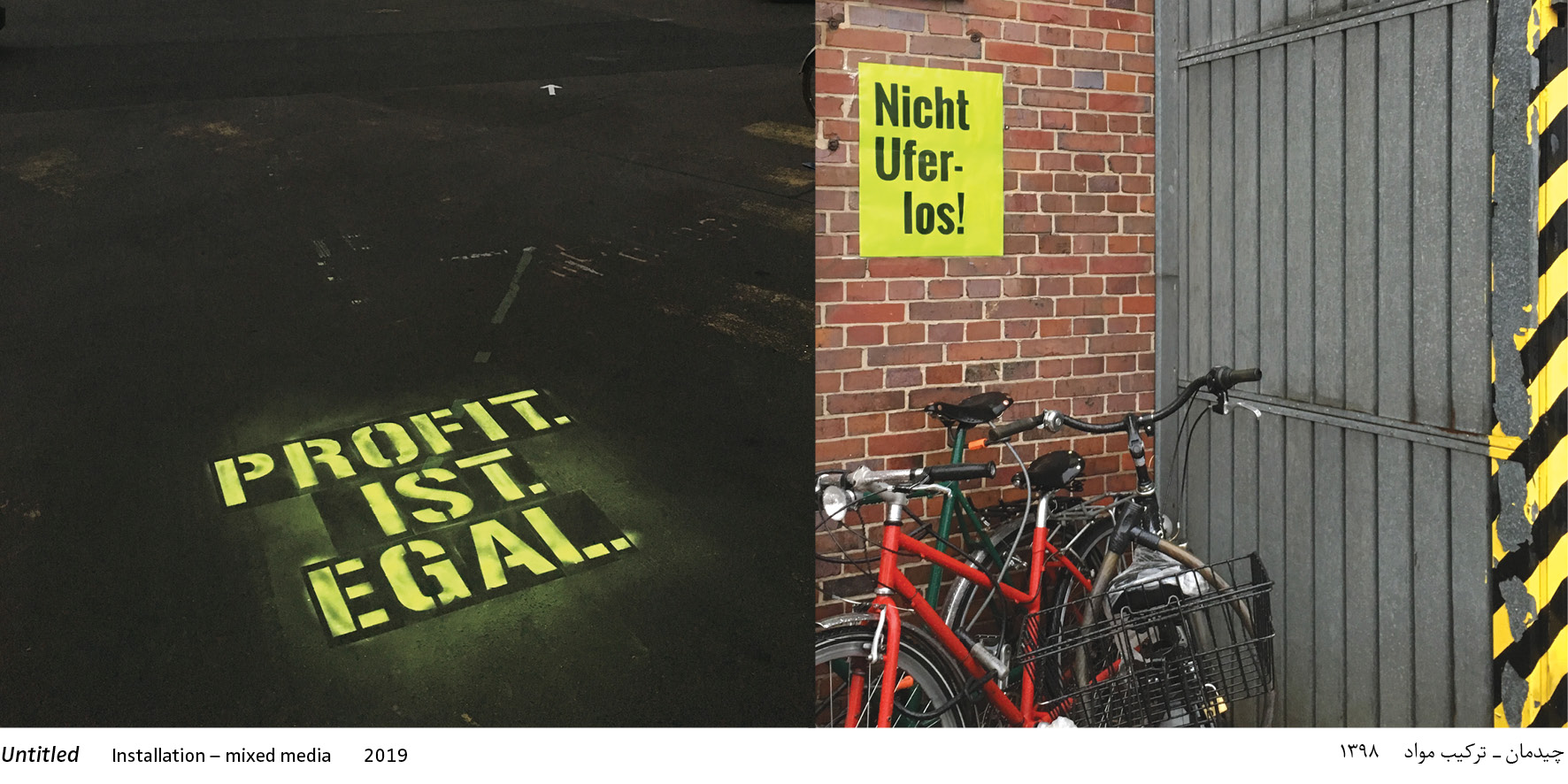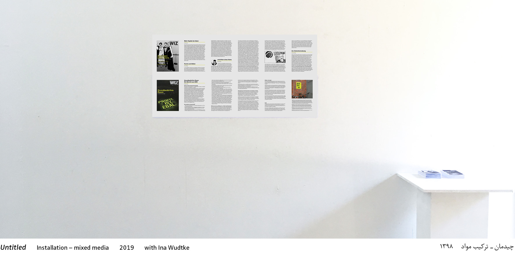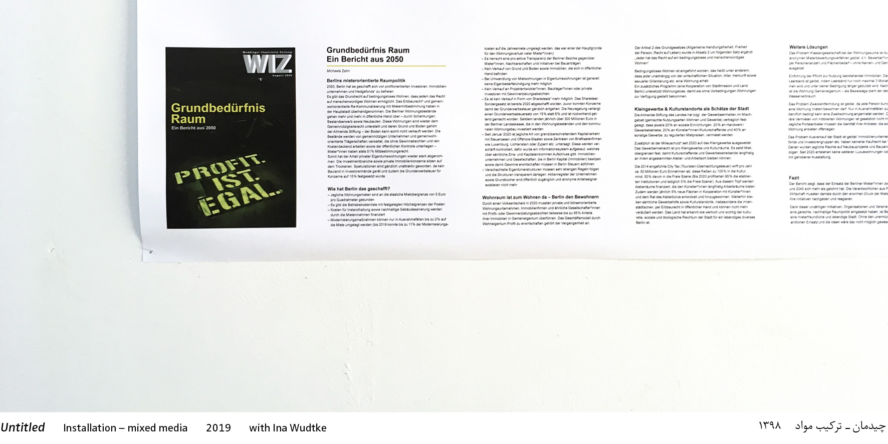 The installation includes two reports published as wall newspaper and flyers. Including a futuristic report from 2050 ‘Grundbedürfnis Raum’ (Space–a Basic Need) by Pantea Lachin, which describes how Berlin's commercial and residential space problems were successfully solved and how a fair housing policy could succeed. Lachin additionally designed posters and spray-painted slogans such as ‘Profit ist egal’ (Profit doesn't matter) and ‘Nicht Ufer-los!’ (Not shore-less!) on the Uferhallen site.