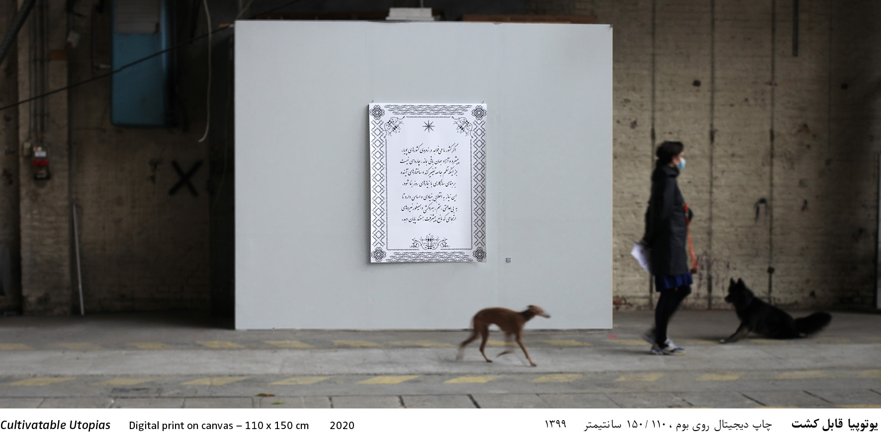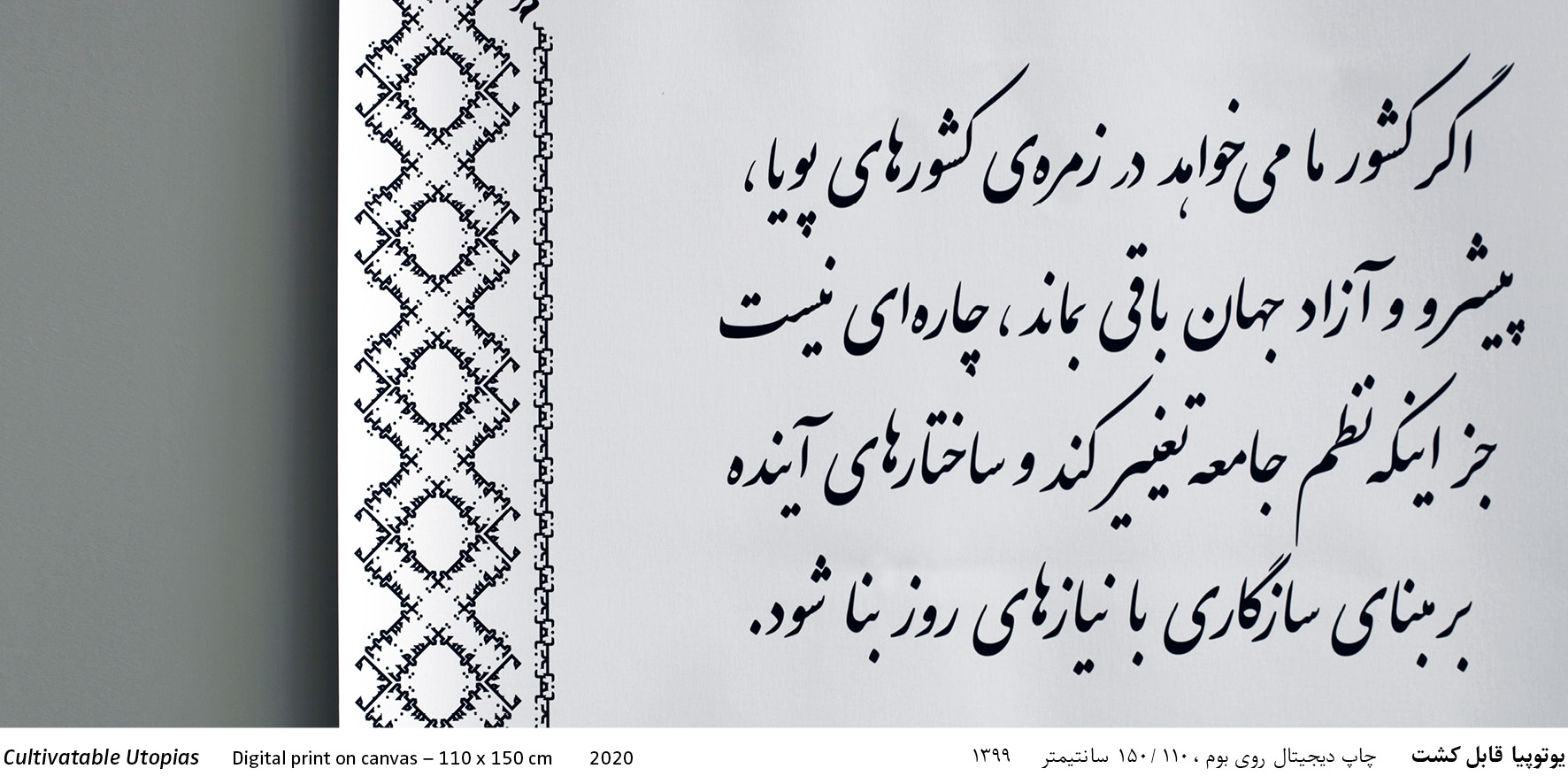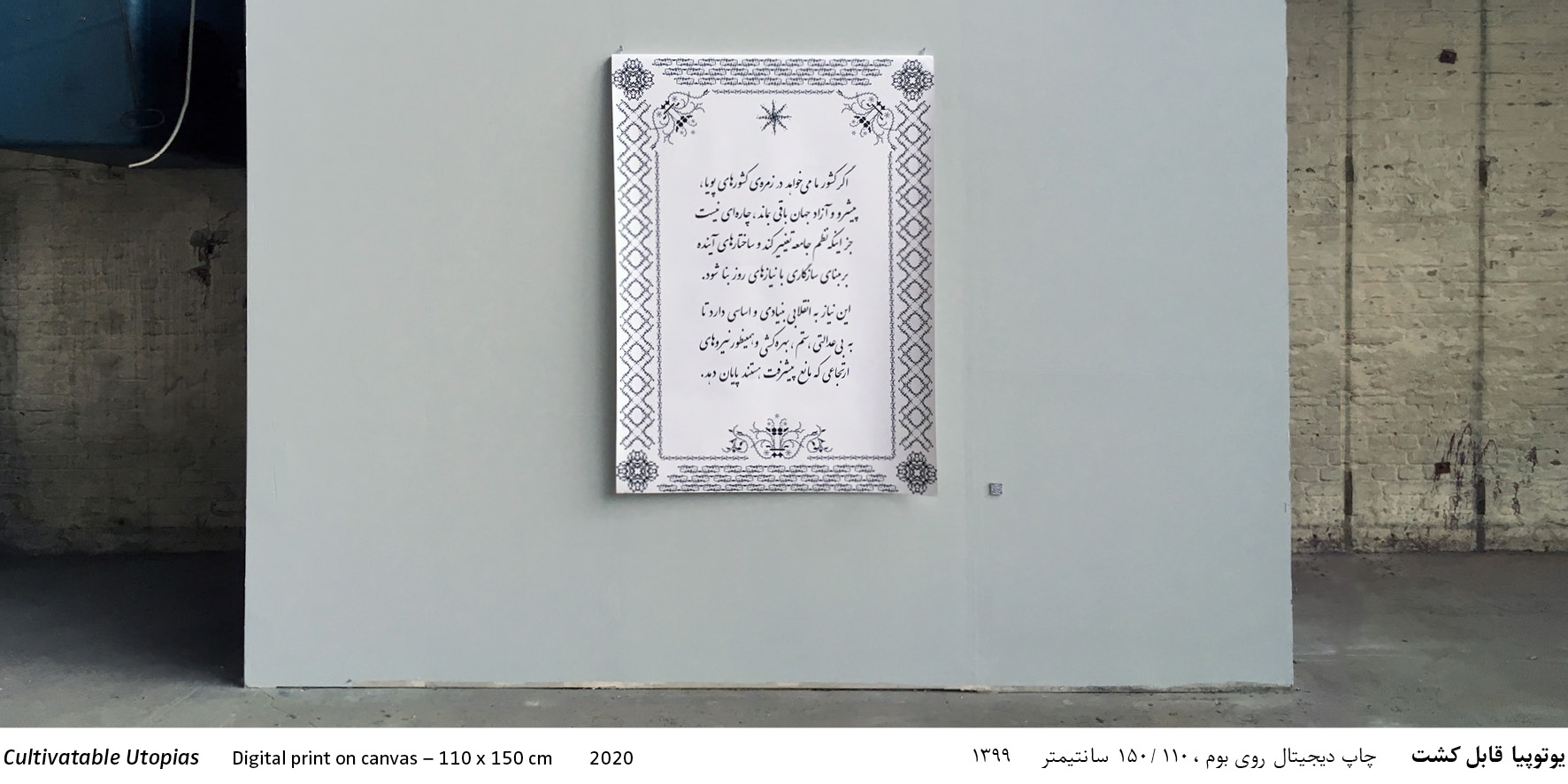 A Quote in Persian language and calligraphic script. The basic element of the ornaments is composed out of the word "Manifesto", written and arranged in the Persian architectural Kufi script. German and English translations are available via a QR code.